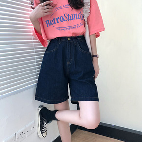 高腰显瘦牛仔短裤女宽松可调节明线装饰五分阔腿中裤