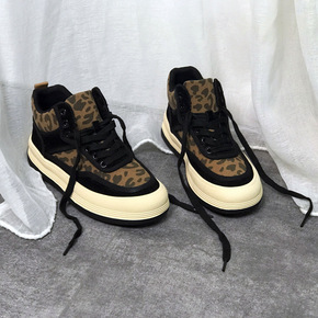 豹纹高帮牛皮板鞋2021年秋季新款时尚休闲厚底增高学生单鞋女鞋子