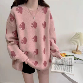 2021秋冬新款慵懒风爱心撞色套头毛衣女宽松圆领中长款针织衫外穿