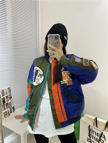 韩版宽松拼色印花贴标棒球飞行服女立领撞色机车羽绒服外套白鸭绒