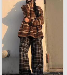 2021秋冬大码女装胖妹妹复古慵懒风条纹毛呢宽松口袋圆领毛衣外套
