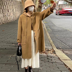 手工双面羊毛大衣女 纯色连帽中长款双面羊绒大衣女批发厂家