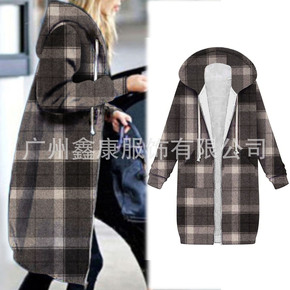 2021欧美亚马逊冬季大码大衣中长款迷彩格子风衣加卫衣女拉链外套