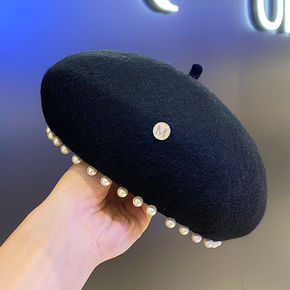 帽子女2022秋冬韩版小香风贝雷帽日系羊毛呢珍珠百搭英伦画家帽子