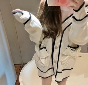 减龄撞色V领镶钻扣毛衣外套女小清新口袋蝴蝶结宽松洋气针织开衫