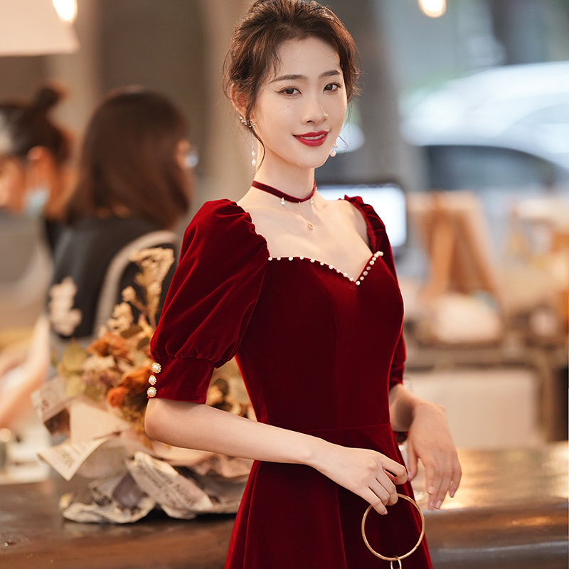 敬酒服新娘2021新款在逃公主连衣裙丝绒订婚礼服红色回门裙秋冬季