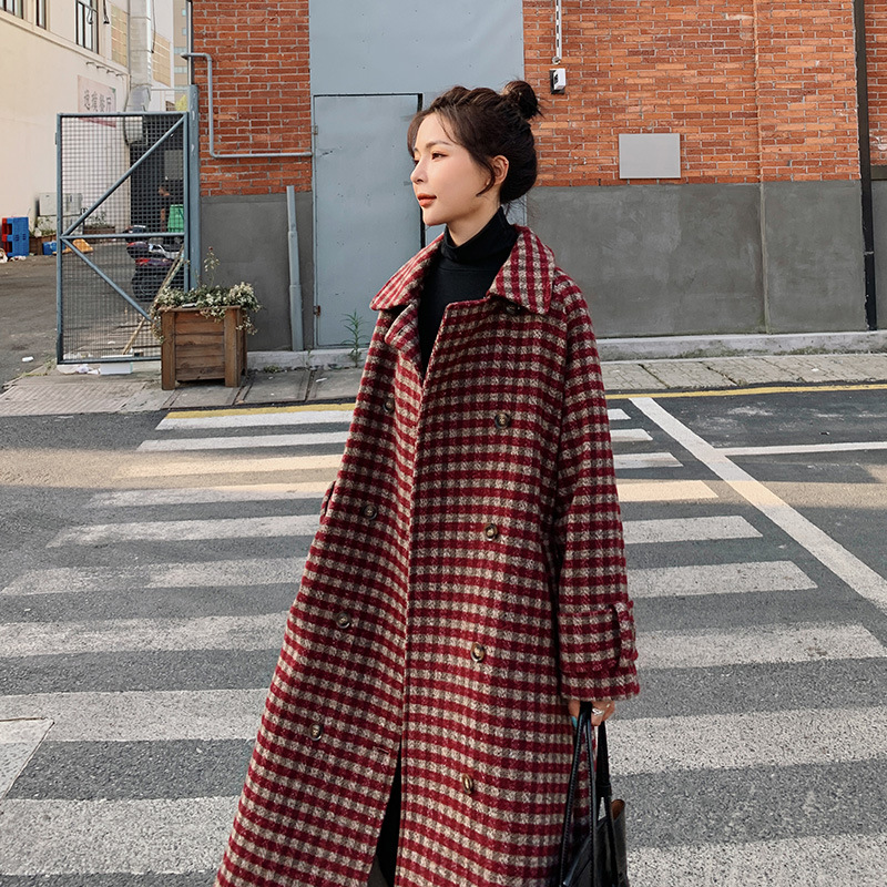 实拍格子毛呢外套女中长款2021新款秋冬韩版宽松收腰流行呢子大衣