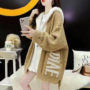 大码女装秋冬季加厚连帽毛衣女中长款外穿宽松针织开衫外套上衣女