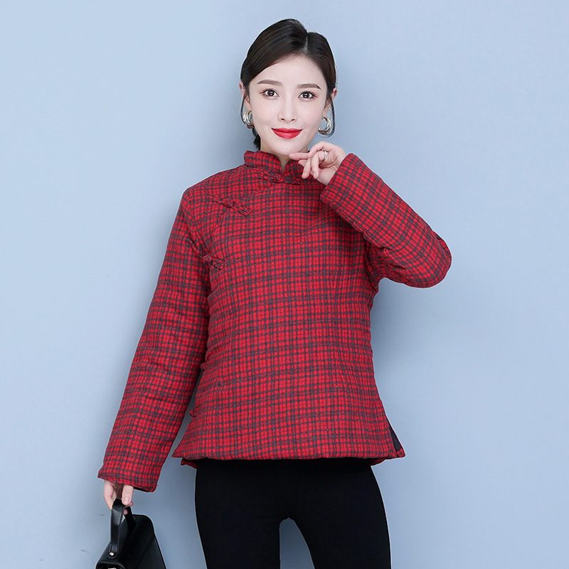 2021秋冬中式女装上衣复古茶服国学棉布格子立领长袖修身短款棉袄