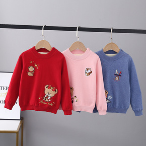 现货秋冬新款男女童宝宝韩版卡通绣花针织加绒加厚双层套头毛衣