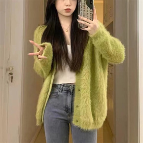 温柔慵懒风抹茶绿毛衣女秋冬季新款仿貂毛纯色长袖针织上衣外套女