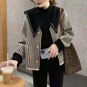 2022冬季女式毛呢外套韩版千鸟格短款针织开衫宽松小香风外套批发