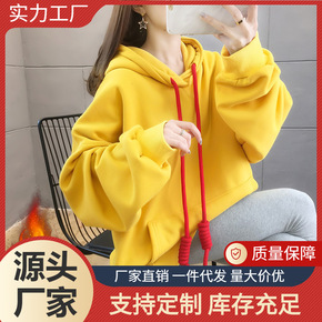 2022春装新品绒衫加绒加厚中长款宽松大码女装纯色连帽卫衣女抽绳