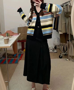 设计感彩虹条纹针织开衫女2022早秋复古拼接宽松外穿短款毛衣外套