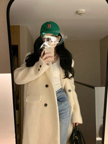 现货 白色羊毛呢大衣长毛水波纹马海毛双排扣加厚西装外套女