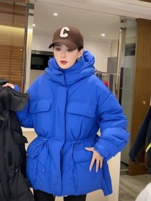 郭幂幂同款小个子中长款大口袋侧边拉链连帽面包抽绳收腰羽绒服女