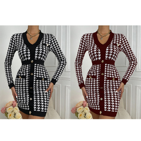 春秋季前排扣千鸟格中腰套头V领长袖迷你短裙连衣裙女
