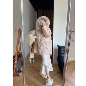 仓古木方糖毛领90白鸭绒羽绒服女22冬季韩版中长款连帽面包服5257