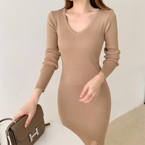 纯色高腰修身V领针织连衣裙韩版黑色开衩性感配大衣打底毛线裙女