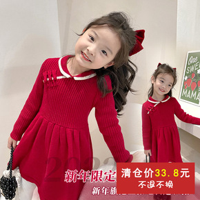 【不退不换清款】女童红色针织裙子冬季儿童盘扣毛衣连衣裙