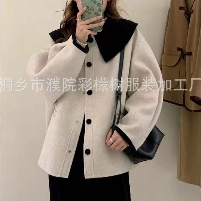 大方领撞色拼接单排扣 阔版小个子短款双面羊毛呢手工缝制大衣