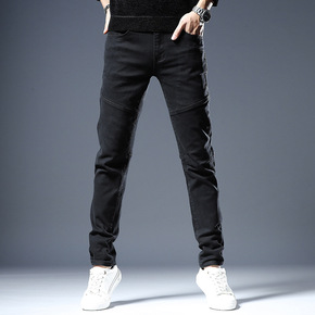 秋季新款潮牌拼接牛仔裤型男修身小直筒韩版弹力多色机车长裤子潮