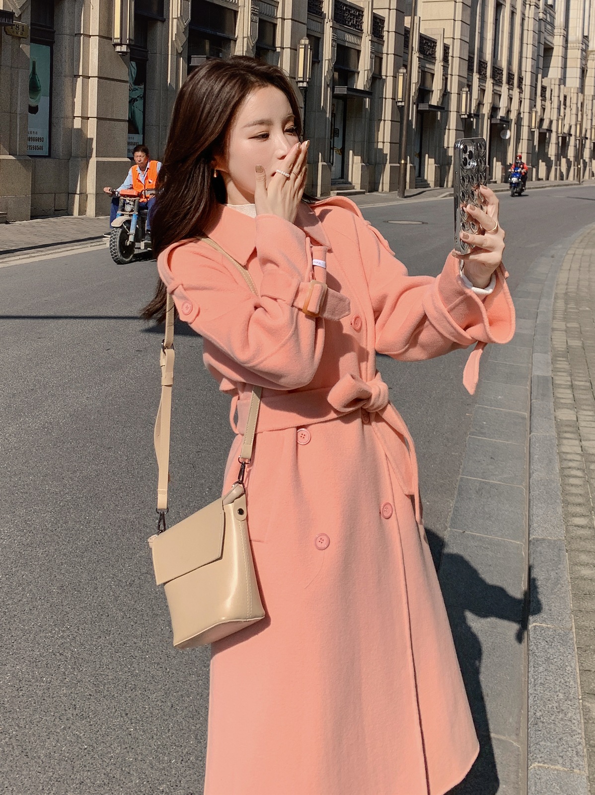 粉色毛呢外套女冬季中长款2021新款小个子高级感气质时尚呢子大衣