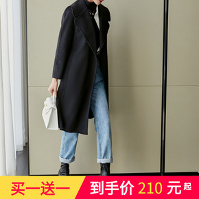 秋冬新款双面羊绒大衣中长款西装领双面呢大衣女腰带黑色高端外套