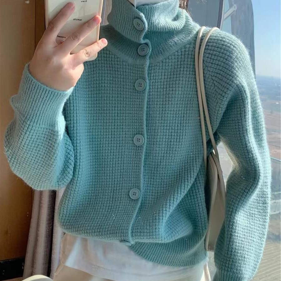华夫格翻领宽松针织开衫外套女早春新款韩版外搭毛衣外穿上衣潮