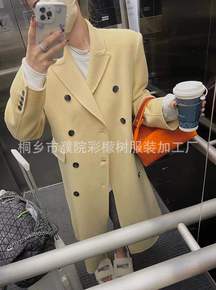 新款垫肩加长款西装法式直角肩双面羊毛呢大衣女士厚外套手工缝制