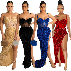 CY9587欧美速卖通wish时尚性感吊带收腰透视高开叉漏背包臀连衣裙