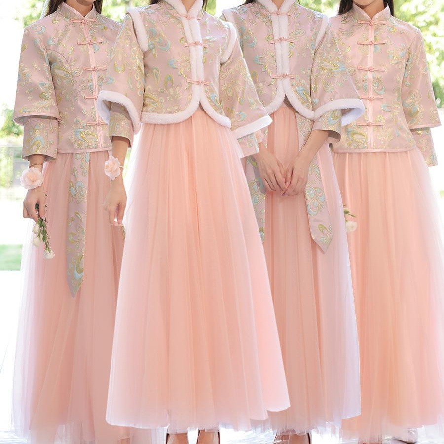 中式伴娘服2021冬季新款中国风新娘姐妹裙伴娘团粉色秀禾晚礼服女