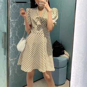 法式波点连衣裙女2022春夏新款气质淑女雪纺裙小个子收腰显瘦裙子