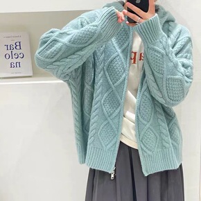 罗女士__纯系学院羊毛大麻花宽松毛衣外套女21秋季中长款针织开衫