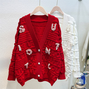 加厚毛衣女冬新款韩版甜美重工钉珠花朵百搭洋气针织v领开衫外套