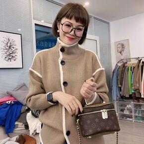 克莱因蓝高领开衫毛衣女秋冬2022新款慵懒风单排扣宽松长款针织衫