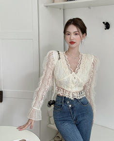 实拍v领蕾丝衫短款修身法式小衫女2022春季很仙内搭打底上衣Y98A