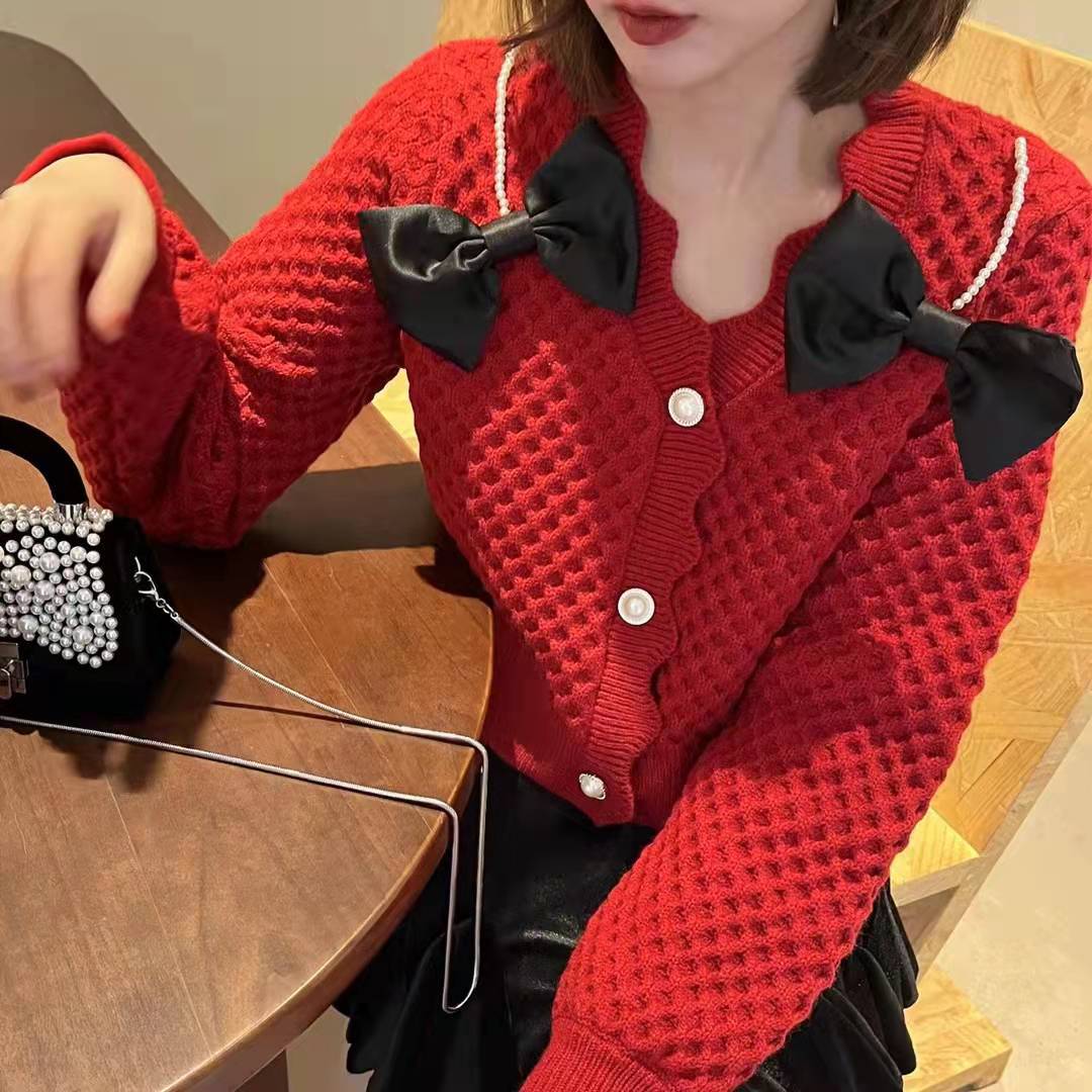 蝴蝶结毛衣开衫女2022早春新款经典V领软糯设计感针织上衣