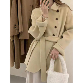2022新款双面呢大衣韩版斜扣收腰腰带小个子短款羊毛外套女装批发
