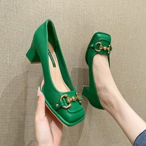 高跟鞋女中跟2022年春夏新款粗跟浅口方头女单鞋金属搭扣奶奶鞋