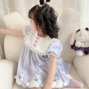 女童春夏小兔子格纹婚纱礼服公主裙洋气宝宝网纱短萌泡泡袖连衣裙