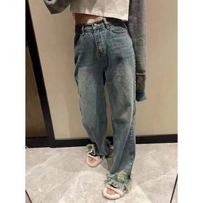 破洞阔腿牛仔裤女设计感重工水洗高腰宽松直筒牛仔裤长裤