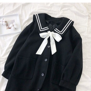日系海军领学院风黑色加厚毛呢外套女春秋百搭小个子呢子大衣冬季