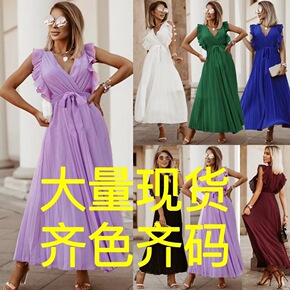 欧美亚马逊气质沙滩长裙时尚修身性感荷叶袖雪纺百褶裙纯色连衣裙
