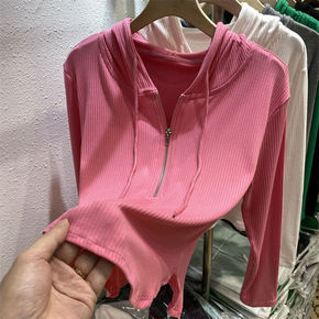2021春季新款T恤女修身长袖内搭打底衫黑色运动洋气紧身连帽上衣