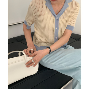 the mind春季新款西装领短袖上衣女韩版宽松撞色针织开衫女71011
