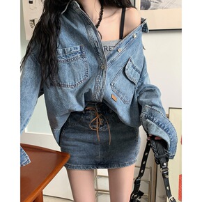 实拍2022新款韩版宽松百搭牛仔衬衫女bf风单排扣水洗牛仔外套