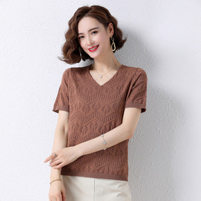 镂空短袖针织t恤女装夏季新款气质通勤韩版冰丝V领纯色上衣宽松女