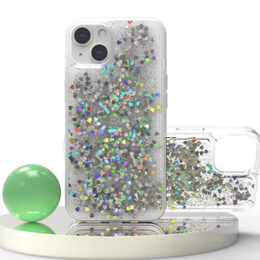 适用于苹果iPhone 14镭射银爱心闪片液体透明流沙手机壳