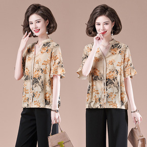 年亲妈妈夏装短袖薄款小衫洋气中老年女碎花雪纺衫中袖V领T恤上衣